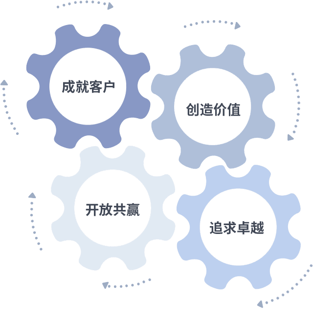 成就客户是一切决策的出发点,,,,创造价值是衡量所有工作的标准,,追求卓越是我们做事做人的态度,,,,开放共赢是我们的格局也是最终的结果。。。。价值观的齿轮环环相扣,,推动着组织里的每个人不断向前。。。。