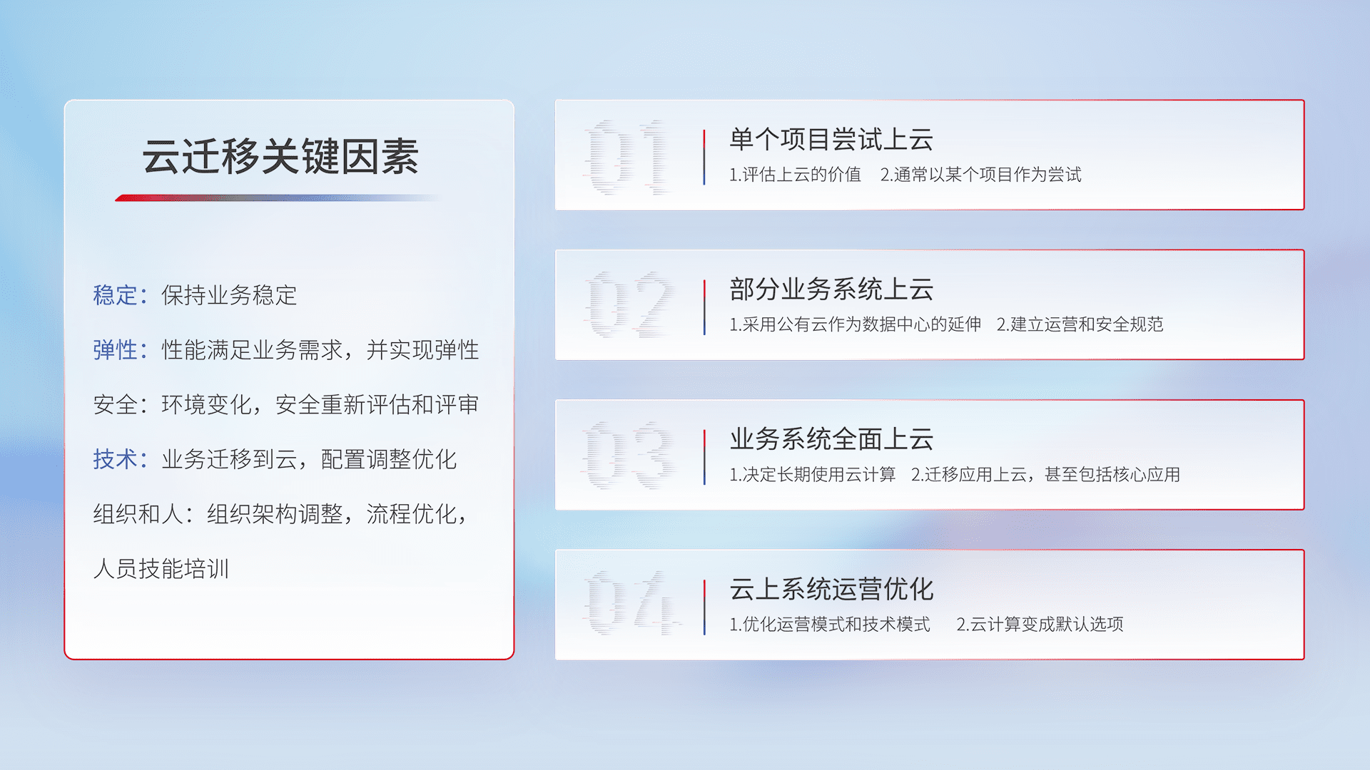 结合实际业务,,,从规划设计、、、、云平台选型、、、云原生改造、、、数据迁移、、、集成交付,,迁移全过程为客户识别最佳上云路径,,,,做好风险识别管理,,,设计网络架构、、、身份权限、、、、安全审计合规、、、操作审计、、、、日志审计、、监控告警策略、、、多站点容灾设计等,,,,对云上基础设施进行整体规划,,,提升IT治理水平,,,,以满足弹性、、高可用、、高性能的需求。。