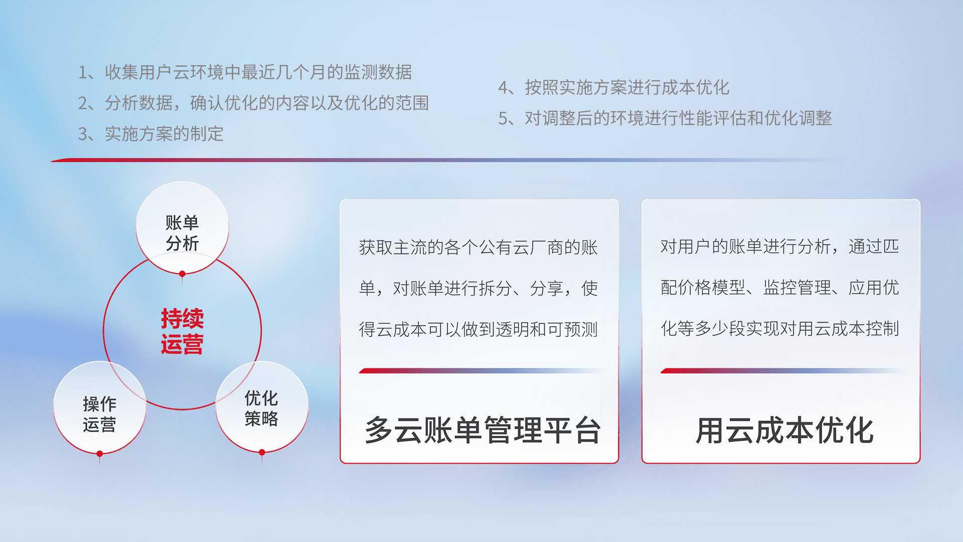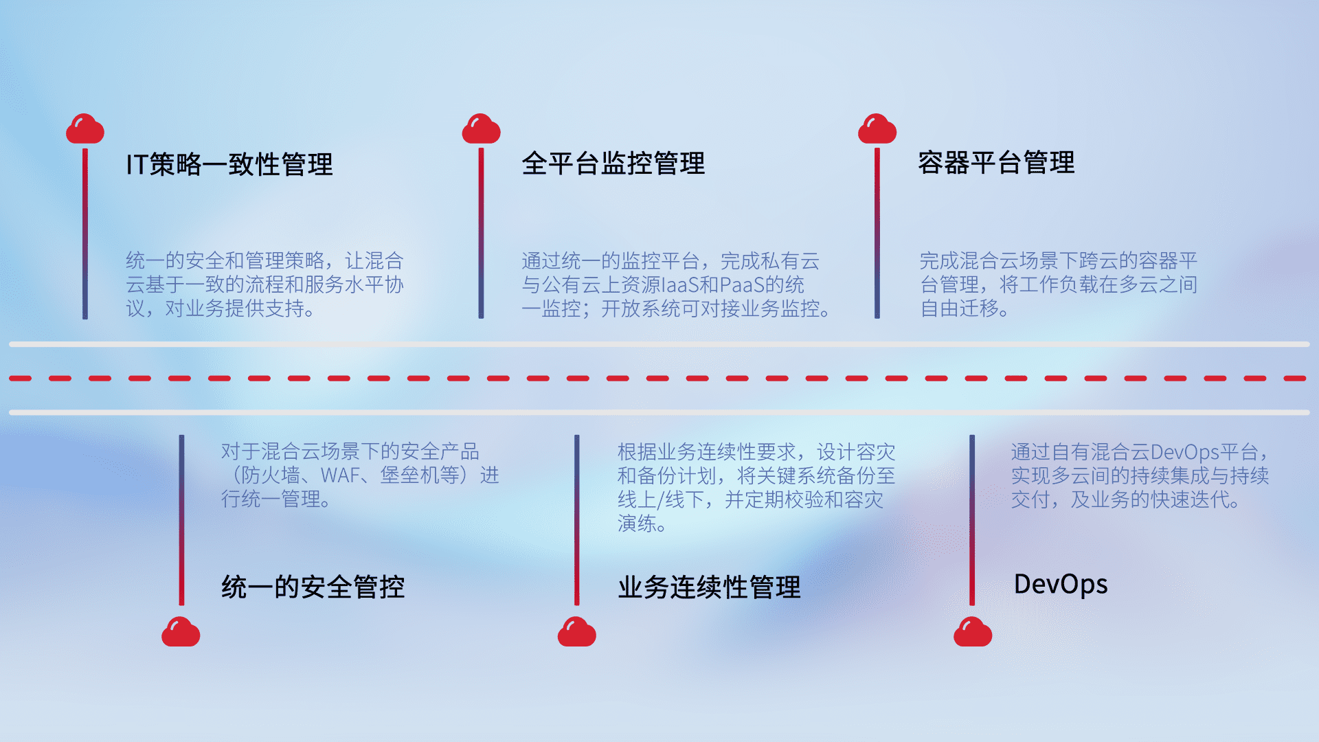 通过多云纳管,,,,以统一的资源数据模型把客户的云资源进行抽象和封装,,,,进而实现对多云资源的统一操作,,,保障云资源管理的可靠性、、稳定性与可用性。。。。量身定制化运维内容,,,配置、、开发运维、、补丁管理、、、、备份、、、、监控、、、、认证和访问管理、、、审计和日常巡检等,,,保障在用云过程中的可靠度,,,,稳定度以及高可用率。。