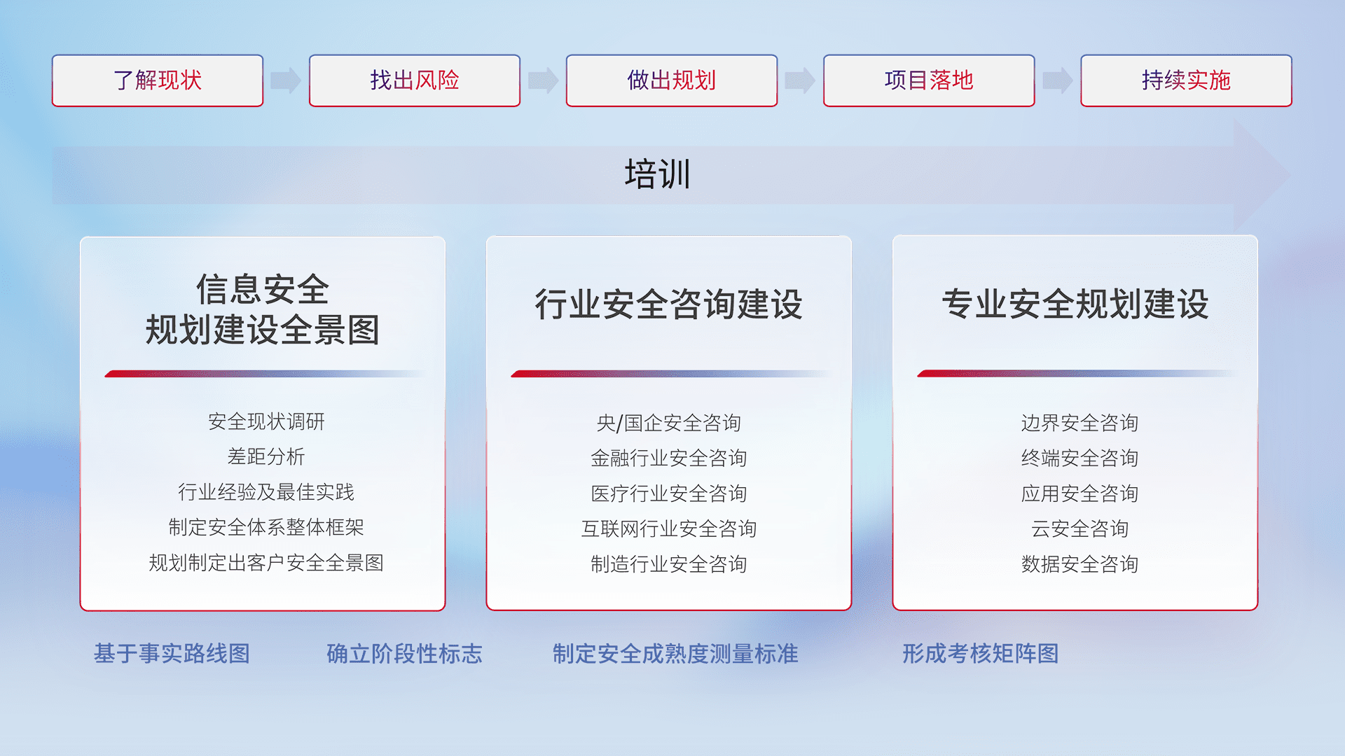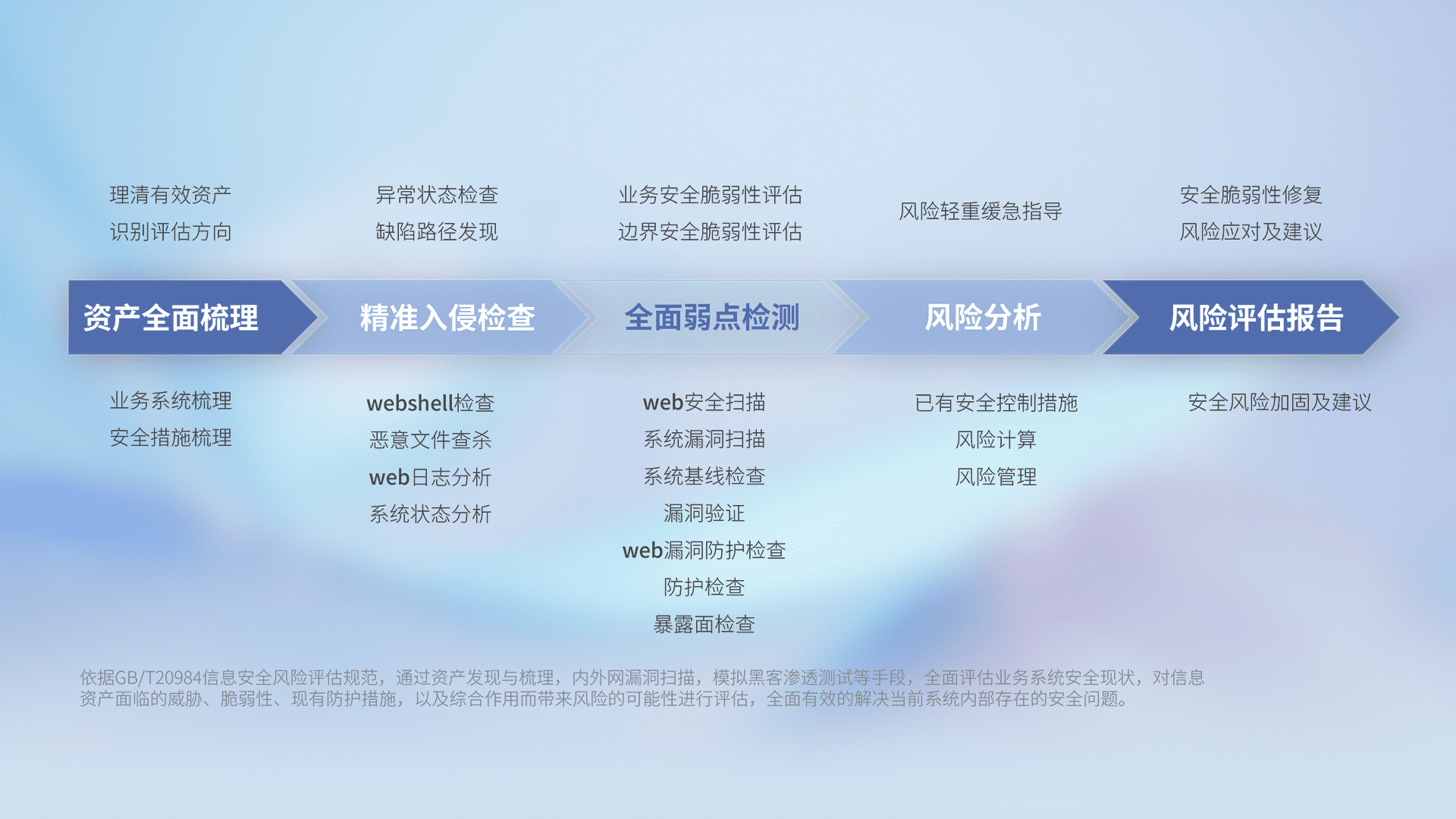 针对客户行业特性,,,以专业的安全服务+多厂商联合解决方案提供专属的一站式安全管理服务,,帮助客户全面感知网络空间威胁,,,基于识别、、、、检测、、、分析、、、防护、、、监测、、、响应的服务理论模型,,,从方案咨询、、、、集成交付、、评估验证、、、、优化加固、、、运维运营,,,致力于为客户提供完整的闭环管理式安全服务。。以实战经验为客户打造高抵御风险的安全体系,,,帮助客户发现威胁、、、、对抗威胁、、、处置威胁,,,,不断积累安全对抗能力,,,持续保障数字化安全。。。。